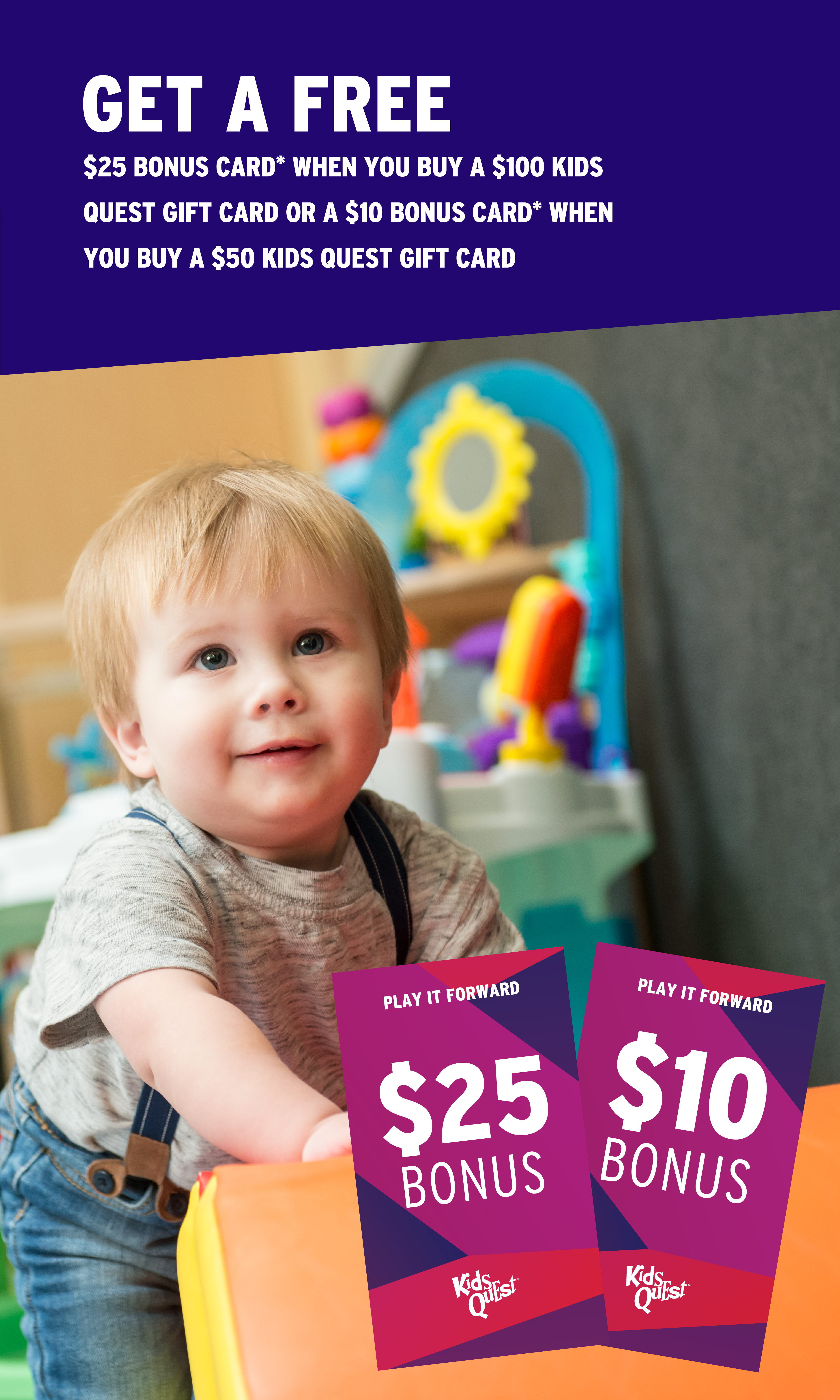 Give the Gift of Play! Purchase a $100 Kids Quest gift card and receive a FREE $25 Bonus Card. Purchase a $50 Kids Quest gift card and...