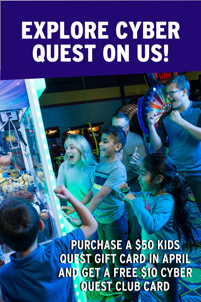 Visit any Kids Quest Las Vegas location and receive a special offer! Score a FREE $10 Cyber Quest Club Card when you purchase a $50 Kids Quest gift card. Offer good at all Las Vegas locations throughout the month of April. Ask a teammate for details.